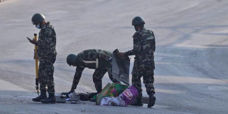 काठमाडौंको ढुंगेअड्डामा फेला परेको विस्फाेटक पदार्थजस्तो देखिने शंकास्पद वस्तु निष्क्रिय पारिएको छ । कालिका पेट्रोल पम्प नजिक आज बिहान भेटिएको दुई वटा शंकास्पद वस्तुको नेपाली सेनाको बम डिस्पोजल टोलीले निष्क्रिय पारेको हो । उक्त ठाउँमा तार जोडेर खतरा लेखिएका दुई वटा प्रेसर कुकर भेटिएका थिए । तस्वीर : आर्यन धिमाल